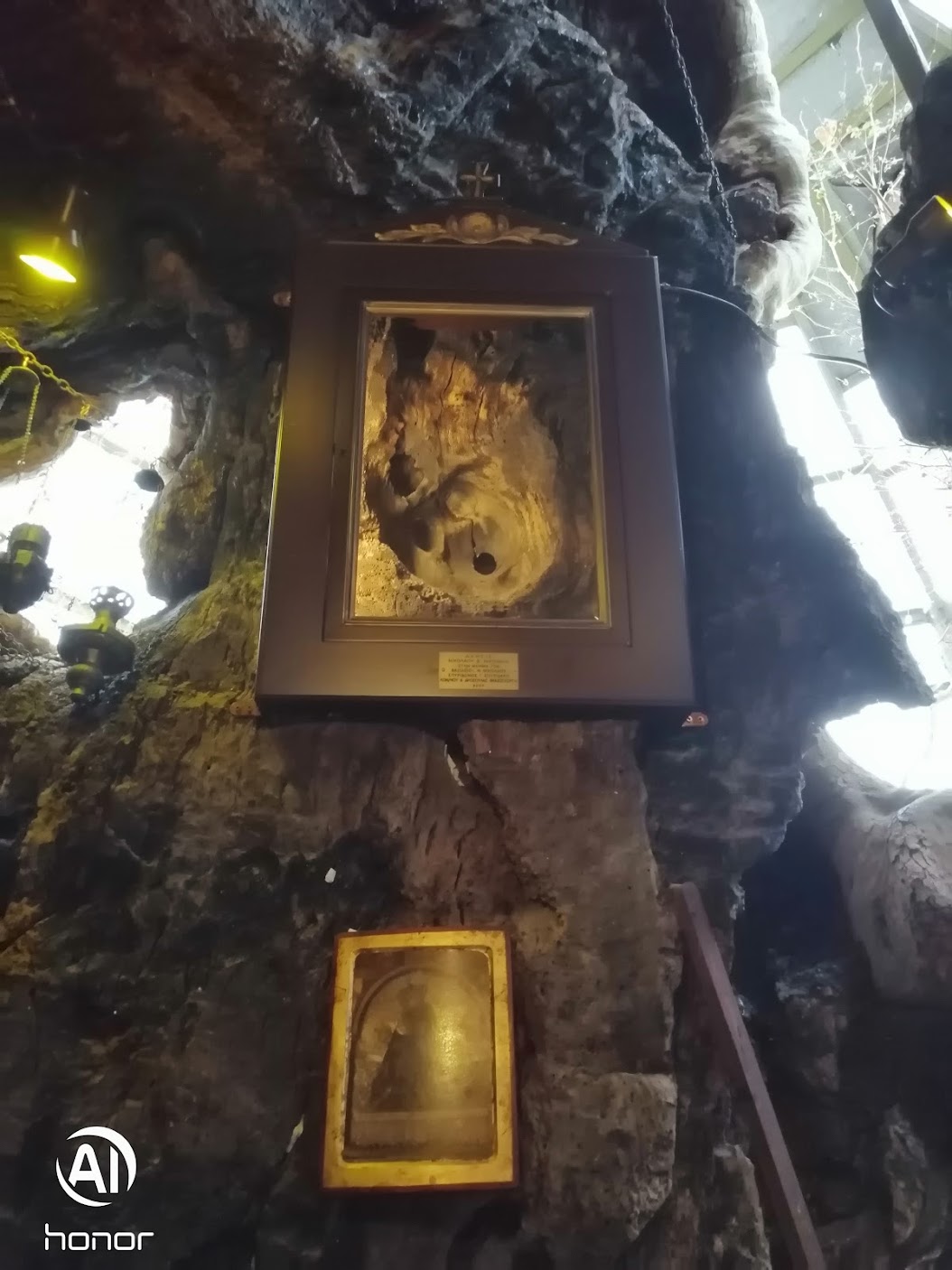 Они шли пешком, и когда они достигли места, которое сегодня является монастырем Пещеры, они устали, заснули и увидели Деву Марию, которая заговорила им подняться в пещеру на скале, чтобы найти Святую Землю.