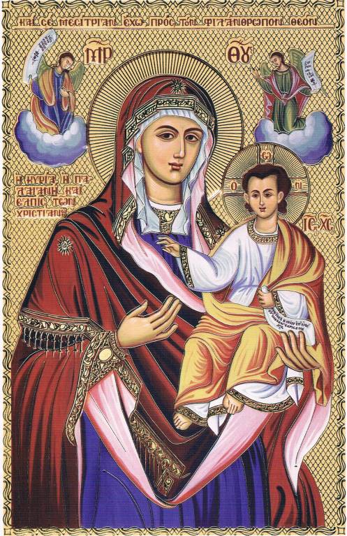 Икона явно греческая, надписи на элинском, я прочитал как "Панагия элпис тон Христиан", что вроде можно перевести "Всесвятая (Богоматерь) Надежда Христиан", но могу ошибаться.